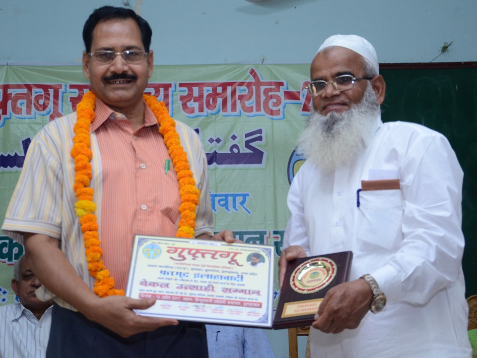 | नरेश कुमार महरानी को ‘बेकल उत्साही सम्मान’ प्रदान करते धर्मेंद्र श्रीवास्तव, प्रो. अली अहमद फ़ातमी और इम्तियाज़ अहमद ग़ाज़ी |
